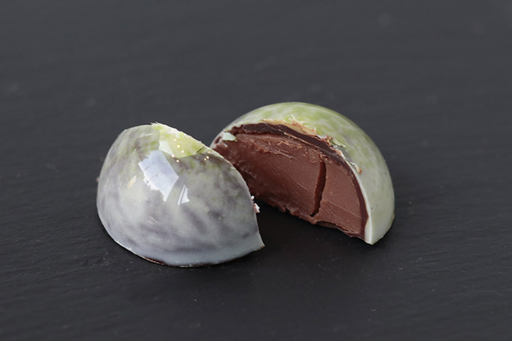 パトリック・ロジェの看板商品は、半球型のドーム。緑色のドーム『アマゾン』。中にライムを効かせたキャラメルが入っている。ロジェ氏はこの作品で、2000年にMOFの称号を獲得した。その数年後に発表した『ソヴァージュ(野生)』は 、やはり同じドームシリーズで、中は柚子とバーベナの風味のキャラメル。今でこそ柚子はチョコレートやパティスリーによく使われる食材だが、当時はまだ珍しくセンセーショナルだった。宝石のように美しいドーム型のチョコレートや、驚くほどにはっきりと利かせたライムや柚子のフレーバーから、パトリック・ロジェといえば斬新、スタイリッシュというイメージが確立した。