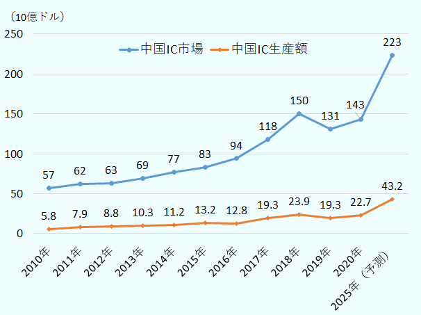 市場調査会社IC Insightsが2021年1月6日に発表したところでは、中国内で消費される集積回路のうち中国で製造されるものの割合は、2010年の10.2%から拡大したものの、2020年に15.9%にとどまり、2025年でも19.4%と予測しており、理想的な状況ではない(注)。