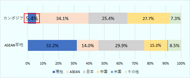 経営上の問題点で最も回答が多かったのが、「原材料の現地調達の難しさ」(60.0%)だった。この回答は、前年比で10.3ポイント減少している(表1参照)。とはいえ、カンボジアの原材料の現地調達率は5.4%。調査国の中で最低だ(図6参照)。国外から調達せざるを得ないというのは、進出企業にとって物流面とリードタイム面でハンディキャップを生む。原材料・素材分野の裾野産業が薄い背景には、電力などのインフラ面はもとより、設備を扱う技術者の不足がある。設備産業が主体の原材料生産工程でインフラは重要で、今後に向けて人材育成は喫緊の課題だ。他方、原材料の現調化が進めば、製造業の新規進出も期待される。