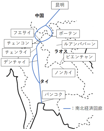 同センターが目指す第1の役割は、昆明からラオス経由でバンコクを結ぶ南北経済回廊の中で、貨物陸上輸送の便宜を図ることにある(図参照)。