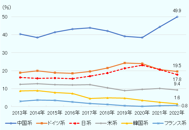 日系は2012年にドイツ系に外資系1位を奪われて以降、一貫して2位にとどまっている。2021年はドイツ系とほぼ同シェアにまで回復したものの、2022年には再度差が拡大した。
