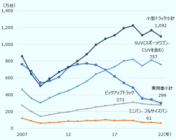 2022年の年間販売台数を車種別に見ると、乗用車は前年比12.6%減、小型トラックは6.4%減だった(表2参照)。他方、小型トラックが全販売台数に占める割合は、データの確認できる1980年以来最高の78.5%となった。中でも、スポーツ用多目的車(SUV)は全体の54.4%を占め、車両の大型化が進んでいることが分かる(表2、図3参照)。