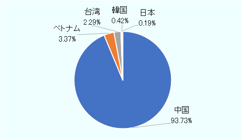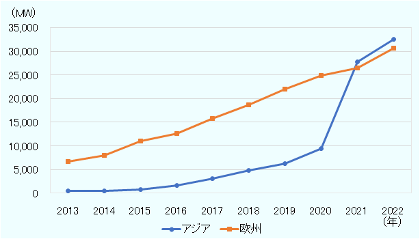 また、アジア域内では現状、中国の導入が全体の93.7%で大部分を占めている(図3参照)。中国では2021年までに導入を進めたものであれば、固定価格買い取り制度(FIT制度)によって一定の価格で発電した電力が取り引きされるため、価格下落の影響を受けない。そのため、2020年から2021年にかけて急速な増加につながったとの見方が強い。