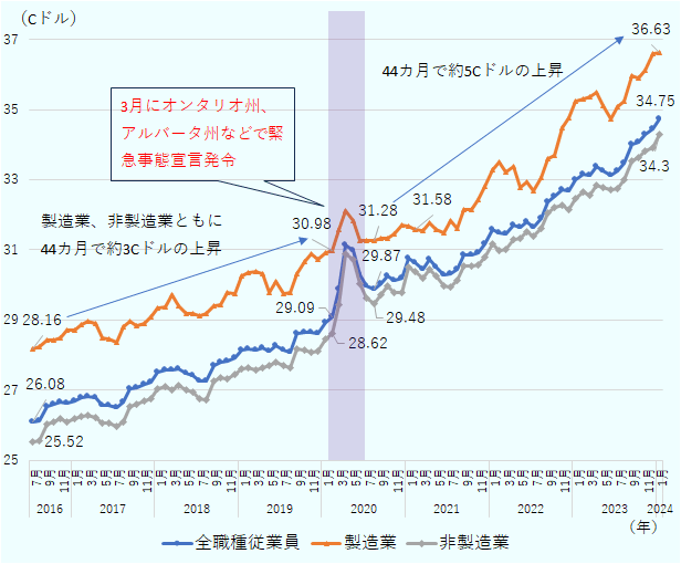 インフレの影響は賃金にも顕著に出ている。新型コロナ禍前と後では、時給の上がり方に大きな差がある。新型コロナ禍前の2016年7月から、新型コロナ禍の影響が大きく見られた2020年2月までの44カ月の間で、時給の上昇率は9.1%だった。しかし、オンタリオ州で緊急事態宣言が発令され、一時的に時給に大きな変化のあった2020年の3~5月の後、6月から2024年1月までの44カ月で、カナダの時給の上昇率は17.1%と、従来の2倍近い伸びがみられる(図8参照)。
