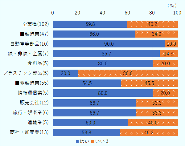 全体としては堅調な経営状況にあると見て取れるが、果たしてその状態が継続するのか、前年度比で状況が改善したか悪化したかのトレンドを見てみたい。業種別の対前年度比営業利益見込みは以下の図3のとおりだ。70.8%が黒字を見込んでいた製造業だが、営業利益が悪化したと回答した企業は35.4%と、3分の1以上となっている。また、プラスチック製品業界では、100%が黒字を見込むと回答しているものの、8割の企業は営業利益が前年度比では悪化したと回答している。運輸業、鉄・非鉄・金属産業では、悪化の割合が改善を上回っており、一概に好調とは言い切れないのが現実だ。