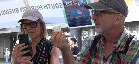 四国産クラフトビールを試飲後に購入を決めた韓国人男性(ジェトロ撮影) - ワインのデラウェア種はバランスが取れていて、おいしい。ラム酒は香りが良い。ビールはIPAがとてもおいしい。