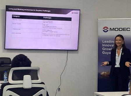 MODECはガイアナで、エクソンモービルの「Uaru」と「Hammerhead」の2つのプロジェクト向けにFPSOプロジェクトを受注している。同社は、急拡大するガイアナの石油セクターの需要に対応するべく、2025年7月に首都ジョージタウンに正式にオフィスを開設。2024年に13人だった従業員は43人(2025年10月23日取材時点)に増え、2026年度までに約250人まで増員する。MODECのガイアナ拠点でコーポレートマネジャーを務めるキム・フイン氏は、ガイアナの投資機会のポイントとして次の4つを挙げた。