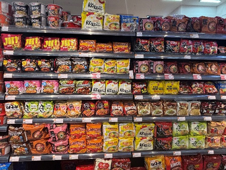 現地スーパーに並ぶ多様な韓国製品(袋麺)(ジェトロ撮影) -