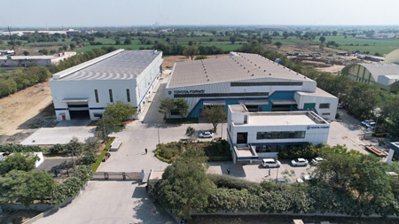 顧客の紹介やジェトロミッションへの参加などを通してインド各地を視察し、現在インドの首相を務めるナレンドラ・モディ氏が当時州首相だった西部グジャラート(GJ)州が最も有望との結論に至った。2013年2月に参加したムンバイでの展示会で、ジェトロがアレンジした通訳からの紹介をきっかけに、同社のインド進出のキーパーソンとなる現インド法人役員のラジクマー・オスワル氏と出会った。豊田社長の「インドで事業をするなら、インドの発展に貢献したい」という理念にオスワル氏が共感し両者は意気投合、豊田社長は出会ったその場で現地アドバイザーとしての協力をオスワル氏に依頼した。そこから会社設立手続きを進め、2013年4月、GJ州最大都市アーメダバードでトヨタ・フォームズ・インディア(以下、TFI)を登記した。2014年5月に10エーカー(4万平方メートル)の土地を購入し、2015年3月に工場建設を開始、2016年1月に当初計画より約2カ月遅れで工場が完成し、4月に生産を開始した。