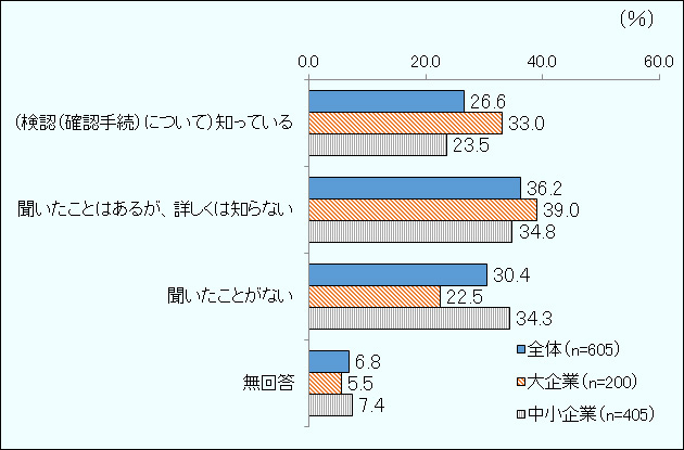 本調査では、検認制度についても認知度を尋ねた(図2)。現在、FTAを利用または利用を検討している企業では、検認制度について「知っている」が19.8%、「聞いたことはあるが、詳しくは知らない」が40.0%、「聞いたことがない」が34.0%であった。FTAを現在利用している企業に限定しても、それぞれ26.6%、36.2%、30.4%で、自己証明制度に比べると、検認についての認知度は高くないことが明らかになった。規模別では、FTA利用企業のうち検認制度について「知っている」は大企業で33.0%に対して中小企業は23.5%、「聞いたことがない」は大企業が22.5%に対して中小企業は34.3%と、対照的な結果がみられた。