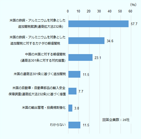 「マイナスの影響がある」と回答した企業が具体的に影響を受ける政策としては、「米国の鉄鋼・アルミニウムを対象とした追加関税賦課(通商拡大法232条)」が57.7%で最も高く、「米国の追加関税に対するカナダの報復関税」が34.6%で続いた(図2参照)。実態調査実施時にはカナダ・米国間の鉄鋼・アルミニウム製品への追加関税(注2)は既に撤廃されていたが、それでも追加関税が上位に挙がったことになる。ジェトロのヒアリングでは、「米国のグループ会社との部品のやりとりにおいて、調達コストの面でマイナスの影響があった」(輸送用機器部品(自動車、二輪車))や「カナダによる対米報復関税により、米国製品に対する輸入関税が約2倍に増え、吸収できる範囲を超えていたので、価格転嫁せざるを得なかった」(汎用・生産用機器)など、追加関税の調達面への影響を指摘する声が複数聞かれた。