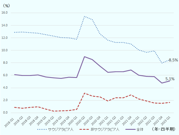 サウジアラビア総合統計庁は6月29日、2023年第1四半期の雇用統計を発表した。人口の約6割を占めるサウジアラビア人の失業率は前年同期比1.6ポイント減の8.5%、非サウジアラビア人を含めた全体では同0.9ポイント減の5.1%だった(図1参照)。前期比ではそれぞれ0.5ポイントと0.3ポイント微増しているものの、新型コロナ禍前の水準を下回っている。サウジアラビアの国内経済は、2022年の経済成長率が8.7%と好調で、雇用環境にも好影響が及んでいる。
