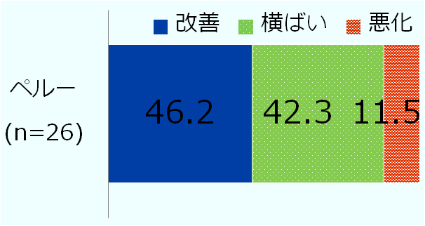 2021年のペルー進出日系企業の営業利益見込みは、「黒字」と回答した企業が68.0%。前回調査から25.6ポイント増と、他国と同様に大幅増だった。前年比の営業利益見込みも、46.2%が「改善」と回答しており、こちらも前回調査比40.0ポイント増と大幅に改善した(図1、2参照)。営業利益見込みで「改善」と回答した12社のうちの91.7%(11社)が、その理由を「現地市場での売り上げ増加」と回答している。さらにその要因としては、11社中9社が「前年の新型コロナによる売り上げ減の反動」と回答した。