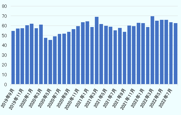 しかし、2022年10月現在、状況は落ち着きつつある。国内主要港における総取扱貨物量は、2020年4月以降、国内需要の回復や世界的なコンテナ不足などによって激しい増減を繰り返してきたが、2022年に入ってから安定化の兆しがみられる(図参照)。2022年3月以降の総貨物取扱量は、コロナ前の水準を超える月間6,000万トン以上で推移している。また、2020年後半から高騰し始めた海上運賃は現在高止まりしているが、ピークは脱した状況である。