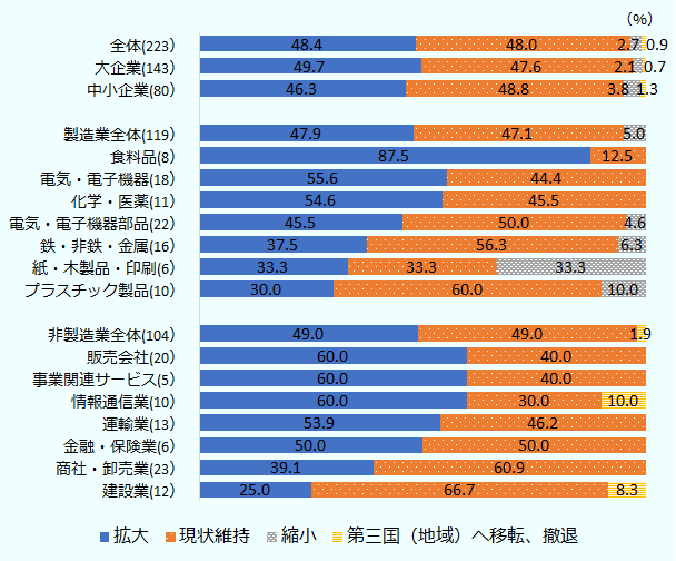 今後1~2年の事業展開については、48.4%の日系企業が事業を「拡大」すると回答した(図2参照)。前年の43.2%と比べて5.2ポイント上昇しており、上昇幅はASEAN主要6カ国(ベトナム、タイ、シンガポール、インドネシア、マレーシア、フィリピン)の中で最も大きい。拡大する理由としては、「成長性、潜在力の高さ」と回答した割合が39.3%と最も高く、「輸出量の増加による売り上げ増加」(37.4%)、「輸出先が増えることによる売り上げ増加」(31.8%)がそれに続いた。その他の自由記述では、「本社の方針として生産拡大や機種移管を打ち出している」(一般機械)や、「チャイナリスク回避による生産再編」(電気・電子機器部品)といった外的要因も示唆された。