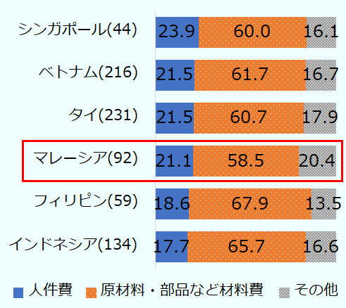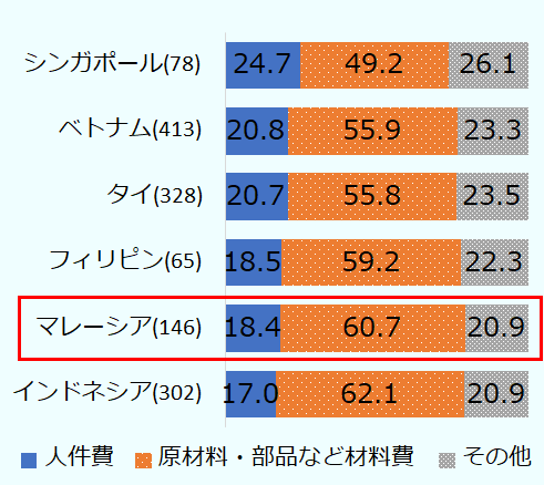 - 企業調査によれば、マレーシアの月額基本給は、製造業ワーカーで430ドル、エンジニアで818ドル、非製造業スタッフで941ドルと、ASEANの中ではシンガポールに次ぐ水準。