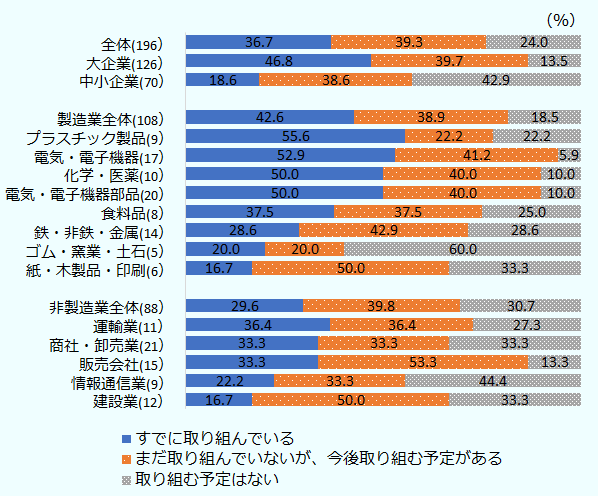 温室効果ガスの削減など、何らかの脱炭素化に取り組んでいる企業の割合は、36.7%に上った。「今後取り組み予定がある」も合わせるとこの割合は76.0%になり、ASEAN主要6カ国の中ではインドネシア(80.3%)に次ぐ。業種別では、製造業で42.6%、非製造業で29.6%が「すでに取り組んでいる」と回答した(図4参照)。
