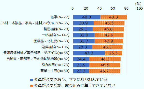 急速に変化するグローバル情勢に対し、企業はビジネスモデル変革や新たなビジネス戦略構築の必要性に直面している。本調査でこれらのビジネス変革の必要性について尋ねたところ、「変革が必要」としている企業の割合は全体の約7割に上った(図1-1参照)。うち、3割はすでに変革に着手している。変革の必要性を最も認識している業種は化学で80.6%、次に木材・木製品など(76.4%)、精密機械(75.9%)と続く(図1-2参照)。また、情報通信機械/電子部品・デバイスではすでに変革に取り組んでいる企業の割合が47.3%と最も高い。新型コロナ感染拡大後、デジタル化やデジタルトランスフォーメーション(DX)の必要性が改めて認識され、国内でもデジタル分野での改革が進められてきた現状が見て取れる。