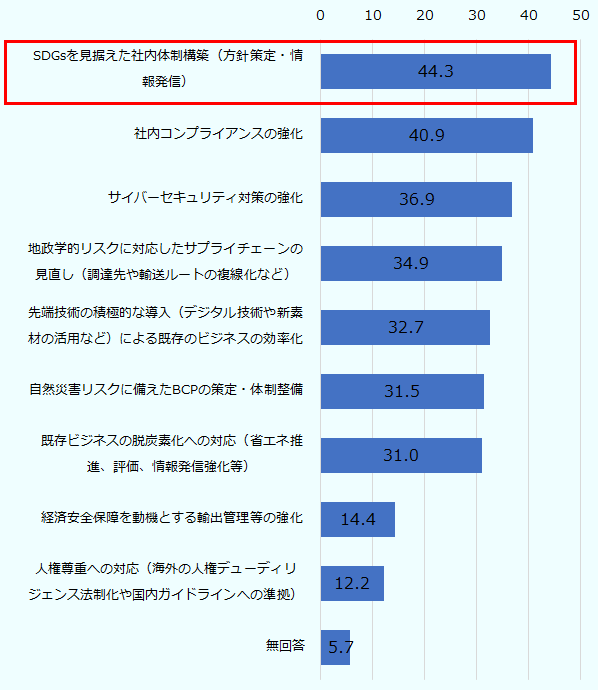 」(2017年3月)によると、SDGsに関連した取り組みにより2030年までに世界全体で年間12兆ドルの市場機会が生み出されると推定している。WBSDCは、SDGsへの取り組みを社会課題の解決のみならず、経済成長のためのイノベーション・ドライバーとして位置付けており、特に医療・福祉、モビリティ、エネルギーの効率化などの分野で市場が拡大すると試算している。2位以下の回答では、「エネルギー不足や原材料価格の高騰に対応する新たな素材・技術・サービス等の開拓」や「脱炭素化に貢献する新たなビジネス・事業領域の開拓」が続く。地球温暖化による気候変動や、環境保護に配慮したエシカル消費への関心はとりわけ若年層で高く、市場における中長期的な成長領域として新たなビジネス創出の機会となっている(2022年12月19日付地域・分析レポート参照)。