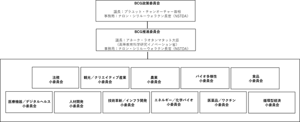 タイ政府は、BCG経済モデルを推進するため、プラユット・チャンオーチャー首相を議長、NSTDAを事務局とするBCG政策委員会を設置。その下に、11の小委員会(法務、観光クリエイティブ産業、農業、バイオ多様性、食品、医療機器・デジタルヘルス、人材開発、技術革新・インフラ開発、エネルギー・化学バイオ、医薬品・ワクチン、循環型経済)を設置している(図1参照)。