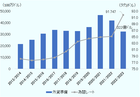 注:「外貨準備」の2022/2023年値は2023年1月末値。「為替レート」は年平均。バングラデシュの年度は7月~6月。