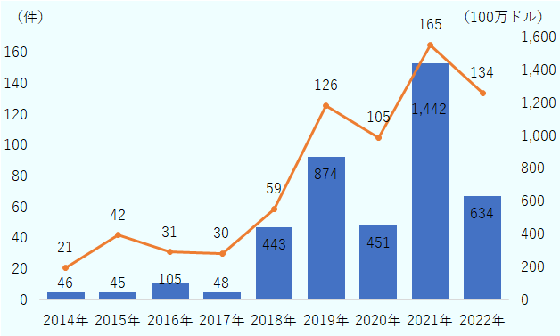 ベトナムのスタートアップ投資は2021年に14億4,200万ドルに達した(図1参照)。投資件数165件とともに、過去最大を記録した。世界知的所有権機関(WIPO)が公表するGlobal Innovation Index(2023年版)では、イノベーションの国際的評価として、全世界132カ国中46位の位置を占める。2013年の76位から大幅に評価を伸ばしたことから、「トップクライマー(Top Climber)」のうちの1カ国と称される。