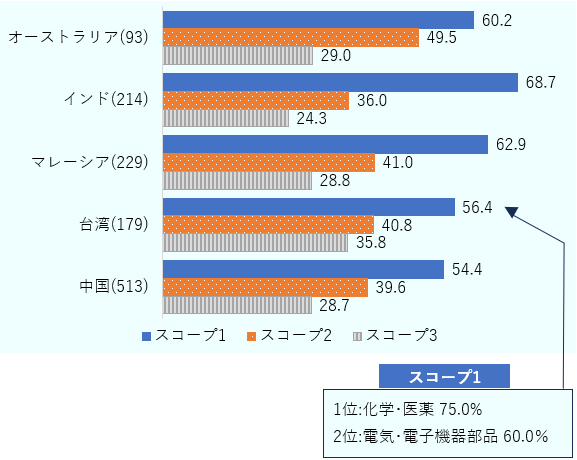図注1:有効回答数が90社以上の国・地域のうち、脱炭素化に向けた取り組みを実施済みもしくは予定と回答した企業の割合で上位5カ国・地域を抜粋。