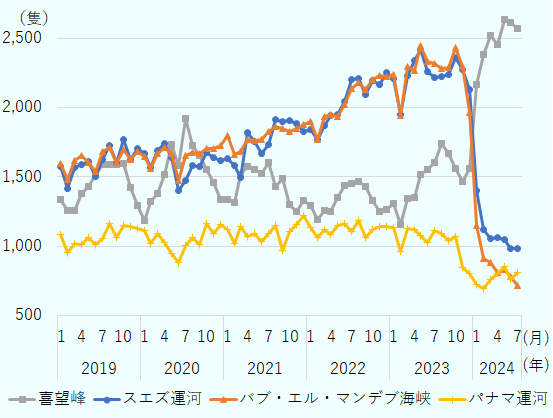 フーシ派による商船攻撃は2024年7月末時点で既に発生から8カ月以上継続しており、欧州~アジア間の最適なルートを寸断している。その影響により、多くの船舶が紅海ではなく、アフリカ南端の喜望峰を回るルートに迂回することを余儀なくされ、輸送日数と輸送コストの上昇をもたらしている。前出のポートウォッチのデータによると、2023年1~11月の紅海のバブ・エル・マンデブ海峡、スエズ運河を運航する船舶はいずれも月間平均2,200~2,300隻で推移していたが、12月を境にいずれも急減し、2024年2月以降の6か月間はそれぞれ月間平均800隻前後、1,000隻前後と、いずれも半数以下に減少している。一方、喜望峰を経由する船舶は2023年半ば以降急増しており、2024年2~7月の6カ月間の平均は月間2,530隻と、前年同期の平均(1,422隻)から8割近く増加している(図1参照)。