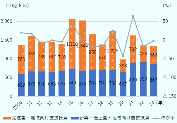 (注2)によると、2018年に世界のFDIは、これまで主要なFDIの受け入れ先だった先進国・地域(金額:6,748億ドル、構成比:49.0%)向けを、新興・途上国・地域(金額:7,014億ドル、構成比:51.0%)向けが上回った。2020年以降も、新興・途上国・地域向けの投資は構成比の6割前後を占めている。2023年の世界のFDIは1兆3,318億ドルを記録し、そのうち先進国・地域向けが4,644億ドル(34.9%)だったのに対し、新興・途上国・地域向けが8,674億ドル(65.1%)となった(図1参照)。