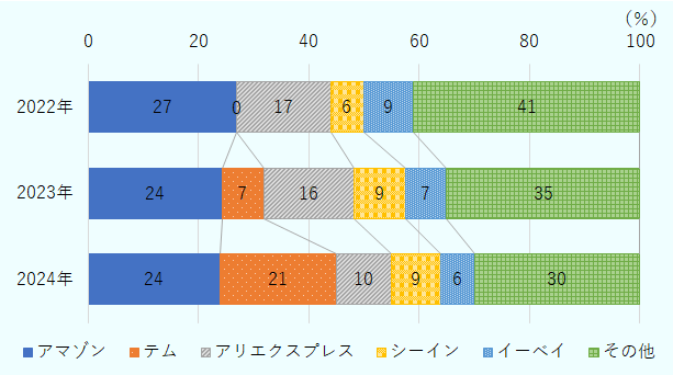 このように、「テム」「アリエクスプレス」「シーイン」は、中国にルーツを持つ越境ECプラットフォームと言える。2024年版調査では、この3社あわせて、シェア4割。世界的に人気を博していることが、ここから読み取れる。
