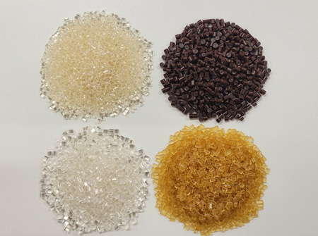 バイオプラスチックペレット(左上、左下は樹木由来、右上はカカオ由来、右下は大麦由来のもの)