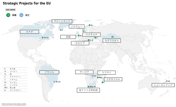 一方で、欧州におけるCRMの埋蔵量や加工・リサイクル能力には限度があり、域内のみで需要を満たすことは難しい。このような観点で、欧州委は域外における供給源の多様化も同時に図っており、2025年6月に前述の47の戦略プロジェクトを補完するかたちで、EU域外の国や地域における13の戦略プロジェクトを選定した。