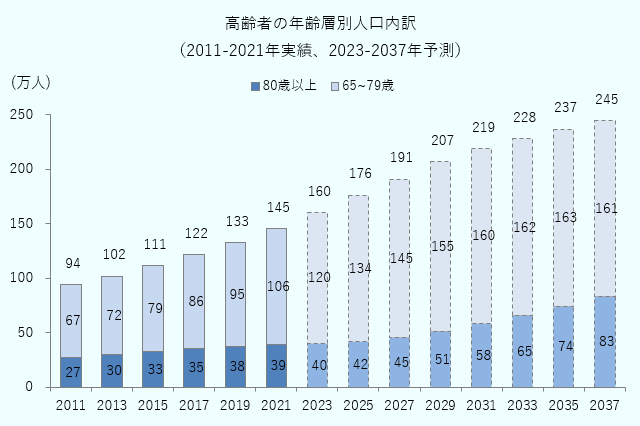 香港では、高齢化がますます懸念されている。香港の全人口に占める高齢者※2の割合は、2011年時点で13.4%(94万人)であったが、10年後の2021年には19.6%(145万人)に達し、現在では5人に1人が高齢者である。最新の政府統計人口予測※3によると、高齢者割合は今後15年間で急速に増加し、2037年には30%(245万人)に達する見込みである。