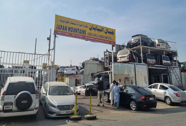シャルジャにおいては中古自動車部品に携わる会社数の方が多く、部品は左右ハンドル車の区別がなくビジネスが行われるという強みも、多くの企業が参入している理由と思われる。シャルジャにはインダストリアル・エリアと呼ばれる区域が1~18まであり、その中で中古自動車部品を扱う会社の集積が多く見られる地区がある。インダストリアル・エリア 3~6の4区域とNew Sajjaと呼ばれる地区に多くの会社があり、中古自動車関連も併せると、その数は14,000社にのぼると言われている。国内外の事故車を購入し解体、パーツを取り出して販売する会社や、また、解体されたパーツを解体会社から調達し、客へ販売する店舗が次々と隣り合わせに並んでいる状態である。客は店を回り値段を確認して交渉、購入する。自国にある修理工場などに販売するのが主な目的である。南アジア(アフガニスタン、パキスタン、バングラデシュ等)アフリカ(タンザニア、ガーナ、ウガンダ等)やロシア、カザフスタンなどからも訪れる。パーツは購入した店舗が客から指定された場所やフォワーダーに運ぶこともあれば、客自身が車で取りに来ることもある。小規模の店舗が多く、直接輸入はせず、卸売業者や自国内で調達するところも多い。