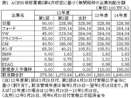 自動車協定の第4次改定の第2条によると、12年度から3年間、相互に関税が撤廃される関税割当の総額は、12年度は14億5,000万ドルだが、13年度は15億6,000万ドル、14年度は16億4,000万ドルに拡大される。ただし、今回、各企業に配分した金額の合計は13年度、14年度とも14億5,000万ドルのままだ。