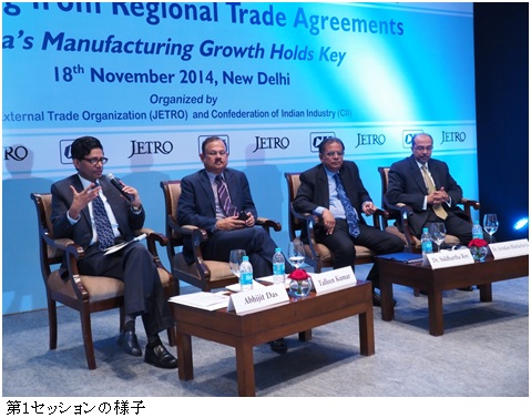 基調講演に続いて行われたパネルディスカッションの第1セッションは、「インド製造業の輸出志向の強化〜そのカギとなる要素〜」をテーマに、デリー・ムンバイ産業大動脈開発公社(DMICDC)社長のタリーン・クマール氏、タタ・サービス経済顧問のシッダールタ・ロイ氏、ボストン・コンサルティング・グループ・インド社長のアリンダム・バッタチャルヤ氏がパネリストとして登壇した。この中で、インド製造業がアジア地域と世界のグローバルバリューチェーン(GVC)に参画し、輸出を拡大させるための具体的な政策の方向性や、アクションプランについて建設的な意見交換が行われた。