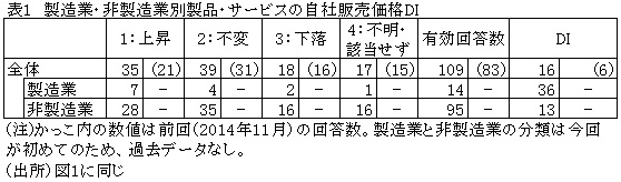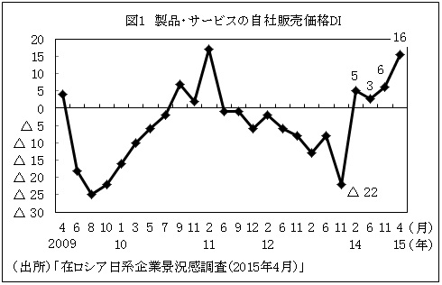 製品・サービスの自社販売価格DIは、ルーブル安を主因とする値上げにより、前回調査(2014年12月25日記事参照)に比べ10ポイント上昇して16となった(図1参照)。特に製造業で値上げする企業の割合が多く、全体では円高、原油高、インフレ高進のあった2011年2月以来の高い伸びだった(表1参照)。ルーブル安による輸入価格の上昇による価格転嫁の動きがみられた一方、競合他社の値下げや国家予算の削減により値上げが難しいとの声も聞かれた。