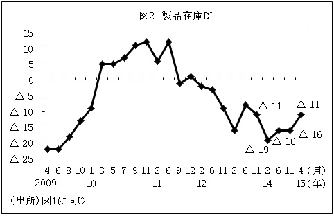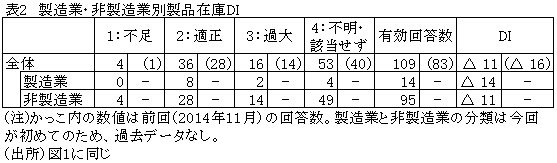 製品在庫DIについては、市場の低迷や資金繰り対策で、在庫の圧縮に努めた企業が多数みられ、DIは前回に比べ5ポイント改善したものの、マイナス11にとどまり、2012年2月以降10回連続のマイナス圏だった(図2参照)。依然「過大」と回答する企業の割合が大きい(表2参照)。販売減による在庫縮小策やルーブル安に伴う輸入減で在庫は減少傾向にある一方、販売減や生産減によって在庫過大とする企業もみられた。