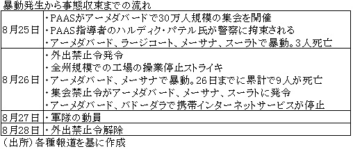 「パテル」という姓を持つカーストの地位向上を求める活動家団体(PAAS:グジャラート語の頭文字)は8月25日、アーメダバードで30万人規模の集会を開催した。同日深夜には、PAAS指導者のハルディク・パテル氏が一時的に警察に拘束されたことを受け、同組織の支持者の一部が暴徒化し、数ヵ所で政府施設や公共交通機関の破壊を行い、警察と衝突した。翌26日は、全州規模での工場の操業停止ストライキや一部地域で暴動が発生し、同州に進出する日系企業を含めた多くの企業が休業を余儀なくされた。しかし、27日には治安維持のために軍隊が投入されたことで緊張は少しずつ緩和され、日系を含む一部の企業は営業を再開。28日になると、一部の地域で残っていた外出禁止令が解かれ、市内はおおむね平常を取り戻した。企業も通常どおり営業している。