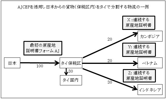 なお、その他のASEAN+1自由貿易協定(FTA)においては、ASEAN中国自由貿易地域(ACFTA)を活用した同様の物流の場合、最初の原産地証明書1通に対して、「連続する原産地証明書」(ACFTAでは移動証明書)が1通に限られるという運用が行われており、一部の企業の間で問題視されている実態がある(2015年10月9日記事参照)。