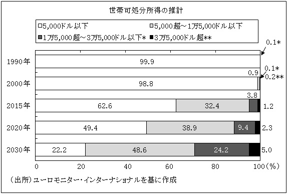 ニールセンの調査では、ベトナムの消費者の73%が生活の質を向上させるためなら支出を拡大しても構わないと答え、回答者の39%は「健康」を関心事に挙げた。また、ユーロモニター・インターナショナルの推計によると、年間可処分所得が5,000ドル超~3万5,000ドル以下の世帯を中間層と定義した場合、ベトナムの中間層は2015年時点で約35%だが、2020年に約50%、2030年には約70%まで拡大すると見込まれている(図参照)。購買力のある中間層の増加とともに、健康への意識は高まると考えられ、日本の健康長寿産業のベトナムでのビジネスチャンスは今後、広がりそうだ。