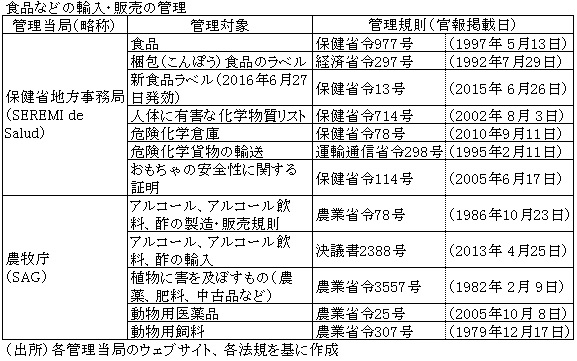 食品の輸入・販売に関しては、保健省令977号(1997年5月13日官報掲載)に基づき、保健省地方事務局(SEREMI de Salud)が管理を行っている(表参照)。食品の輸入・販売を行うためには、税関宛て証明書(CDA:税関からの荷物取り出しを許可する)および使用・販売許可を取得しなければならない。