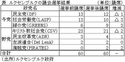 選挙結果によると、グザビエ・ベッテル首相の率いる連立与党で中道右派の民主党(DP)は1議席失い12議席、同じく連立与党の社会労働党(LASP)は3議席減の10議席、緑の党は選挙前の予想より健闘し、3議席増の9議席となった(表参照)。連立与党3党の合計議席数は31議席と、過半数を辛うじて維持した。
