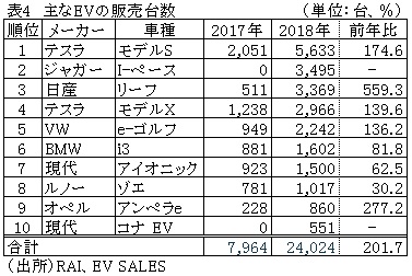 さらにRAIは2019年1月4日、2018年のEVの販売台数を2万4,024台と発表した。2017年の7,964台の3倍、乗用車の新車販売台数(44万3,812台)全体の5.4%に相当する。車種別の販売上位は、テスラ「モデルS」(5,633台、前年比2.8倍)、「モデルX」(2,966台、2.4倍)、ジャガー「I-ペース」(3,495台、前年実績なし)、日産「リーフ」(3,369台、6.6倍)、VW「e-ゴルフ」(2,242台、2.4倍)となっている(表4参照)。