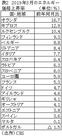 オランダのエネルギー価格は前年同月比16.7%増と急上昇しており、ユーロ圏で最高の上昇率となった(表2参照)。オランダでは住宅用エネルギーは主に電気と天然ガス、地域暖房で構成されており、特に天然ガスの使用比率が高い。ガスなどの価格上昇に加え、電気、天然ガスなどに課されるエネルギー税の増税も価格上昇の要因となった。