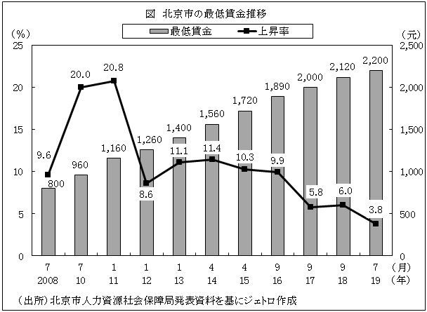 )を発表した。7月1日から北京市の正社員(全日制労働者)の最低賃金基準が、月額2,120元から2,200元(約3万5,200円、1元=約16円)に引き上げられる。上昇率は3.8%で、2018年の6.0%を下回った。時給換算では、12.18元から12.64元に引き上げられることとなる。