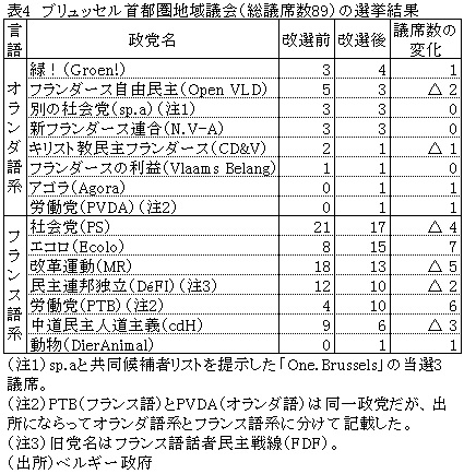 ワロン地域(南部、主にフランス語圏)では、改選前に連立政権を組んでいた「MR」と「中道民主人道主義(cdH)」が議席を減らす中、「エコロ」と「労働党」が躍進(表3参照)。「社会党」(PS)は議席を大きく減らした。ブリュッセル首都圏地域(仏蘭バイリンガル)でも同様の傾向が見られた(表4参照)。