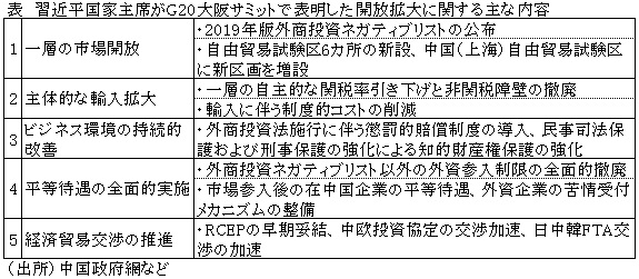 中国の習近平国家主席は、G20大阪サミットに出席するため、6月27~29日に日本を訪問し、28日のサミット初日討議において、対外開放の推進などを表明した。