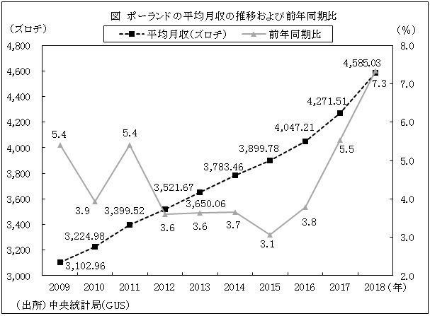 ポーランドでは平均月収の上昇が続いている。2018年の平均月収(額面)は4,585.03ズロチで、2009年と比較すると5割増となっており、今後も上昇傾向は続くと思われる(図参照)。