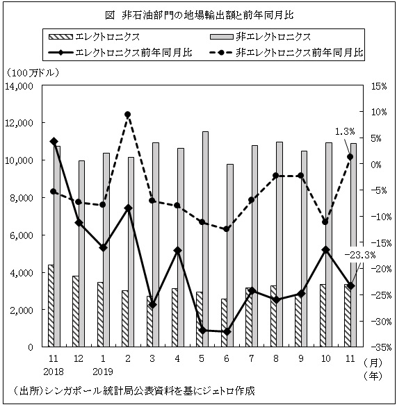 シンガポール貿易産業省傘下の産業振興・貿易振興機関のエンタープライズ・シンガポール(ESG)の発表(12月17日)によると、11月の非石油部門の地場輸出額(自国生産による物品輸出で、再輸出を除く)が前年同月比5.9%減となった。前月(12.5%減)に比べマイナス幅は縮小したものの、9カ月連続のマイナスとなった。